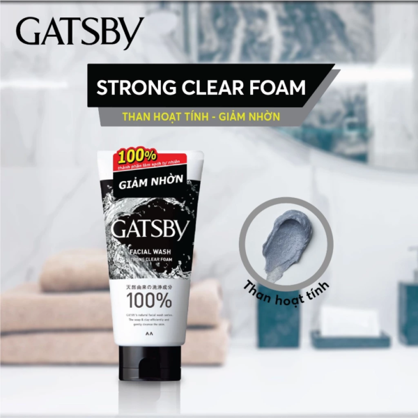 Sữa rửa mặt than hoạt tính Gatsby Facial Wash Strong Clear Foam giúp loại bỏ lớp dầu bẩn và khó trôi cùng bã nhờn trên da mặt nam giới. Ngăn ngừa mụn, giữ cho da mặt sạch sẽ, mịn màng, không bóng nhờn. Cảm giác mát lạnh sảng khoái, dễ chịu sau khi rửa mặt.